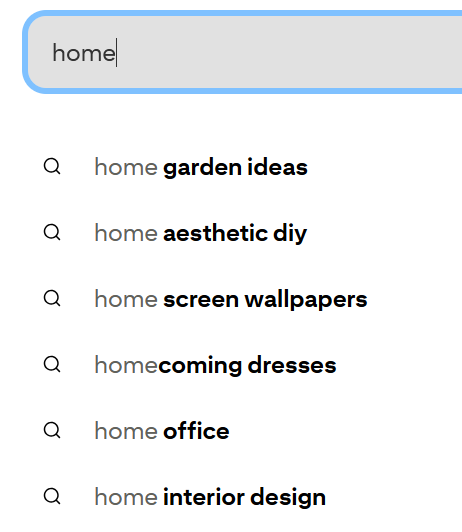 Kun alat kirjoittaa Pinterestin hakukenttään, näet suoraan mitä ihmiset etsivät. Hakuehdotukset perustuvat ajankohtaisiin trendeihin ja kertovat, mitkä sanat painavat eniten. Myös alempana listassa näkyvät fraasit voivat olla hyödyllisiä, joten niitä ei kannata ohittaa.